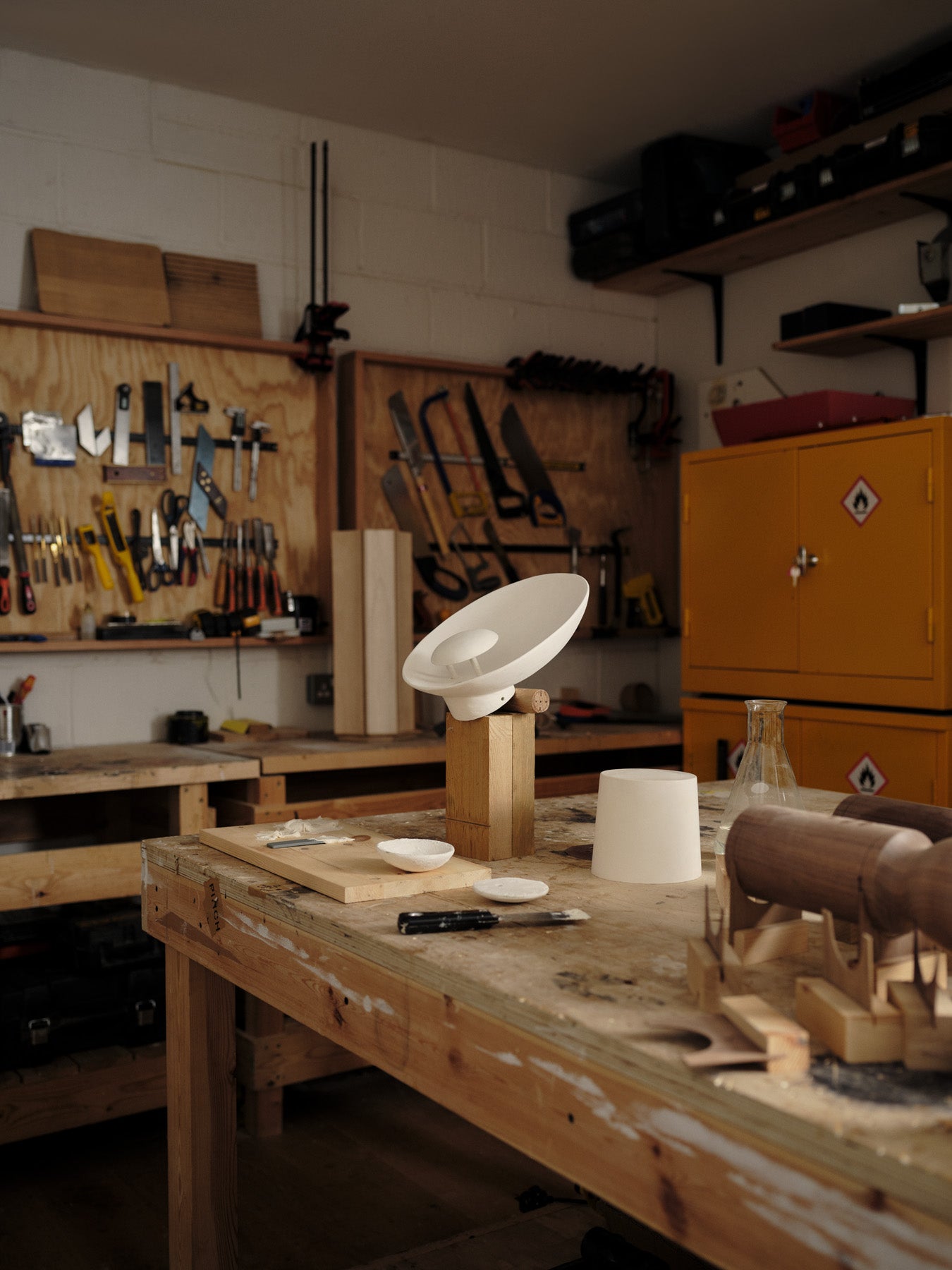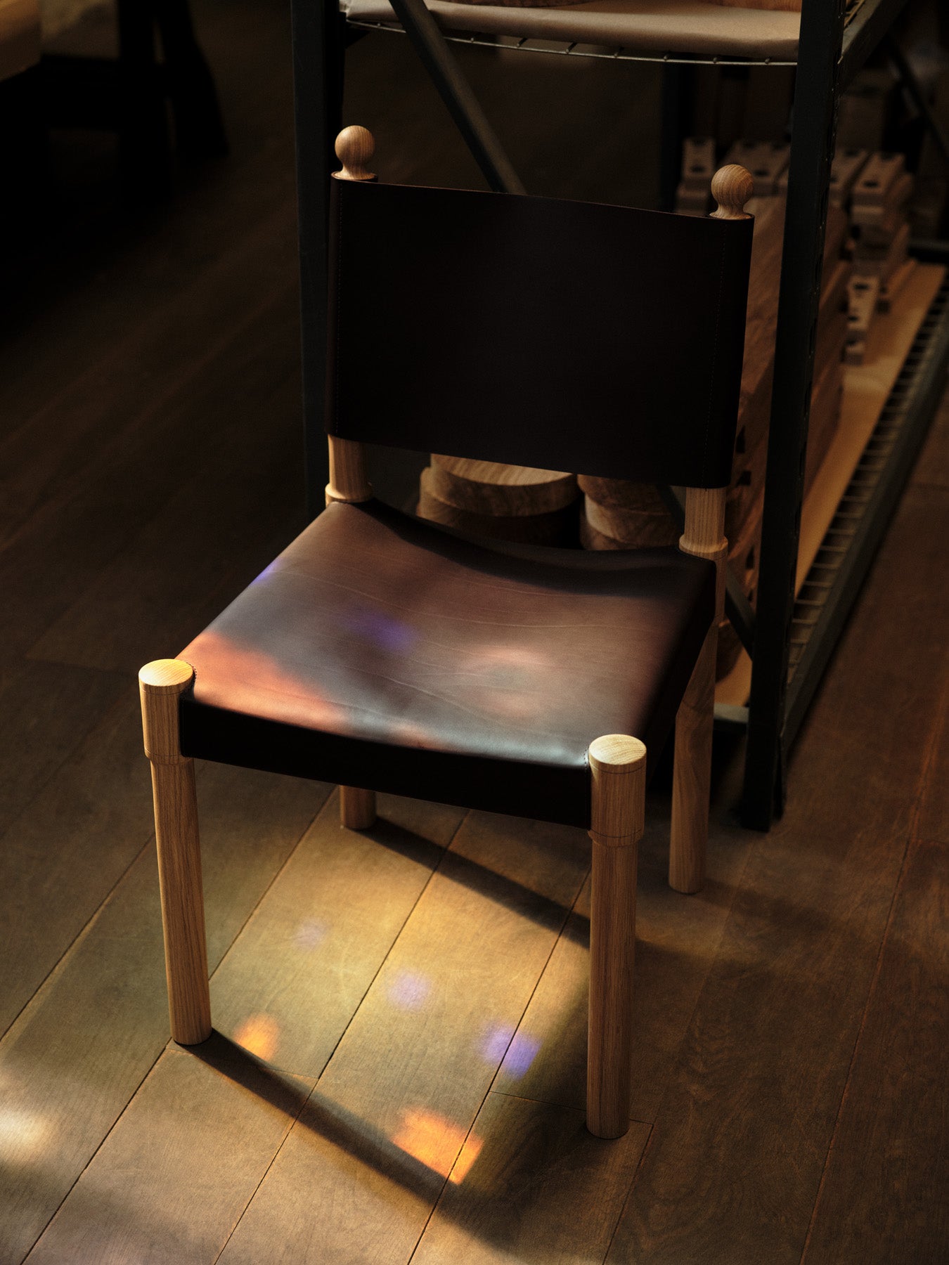 We have stained glass windows high on the walls of our studio. They are a curiosity in an otherwise industrial space. As the day progresses, fragments of coloured light dance delicately across the surface of the walls and floor. A delicate spiral staircase leads to the workshop downstairs. Here, dust hangs in the air, and the smell of oil and wood stain is backed by the constant hum of a sander. In the belly of our busy studio, in-progress prototypes and rough cut sections of timber lie quietly, waiting to be employed by our products.