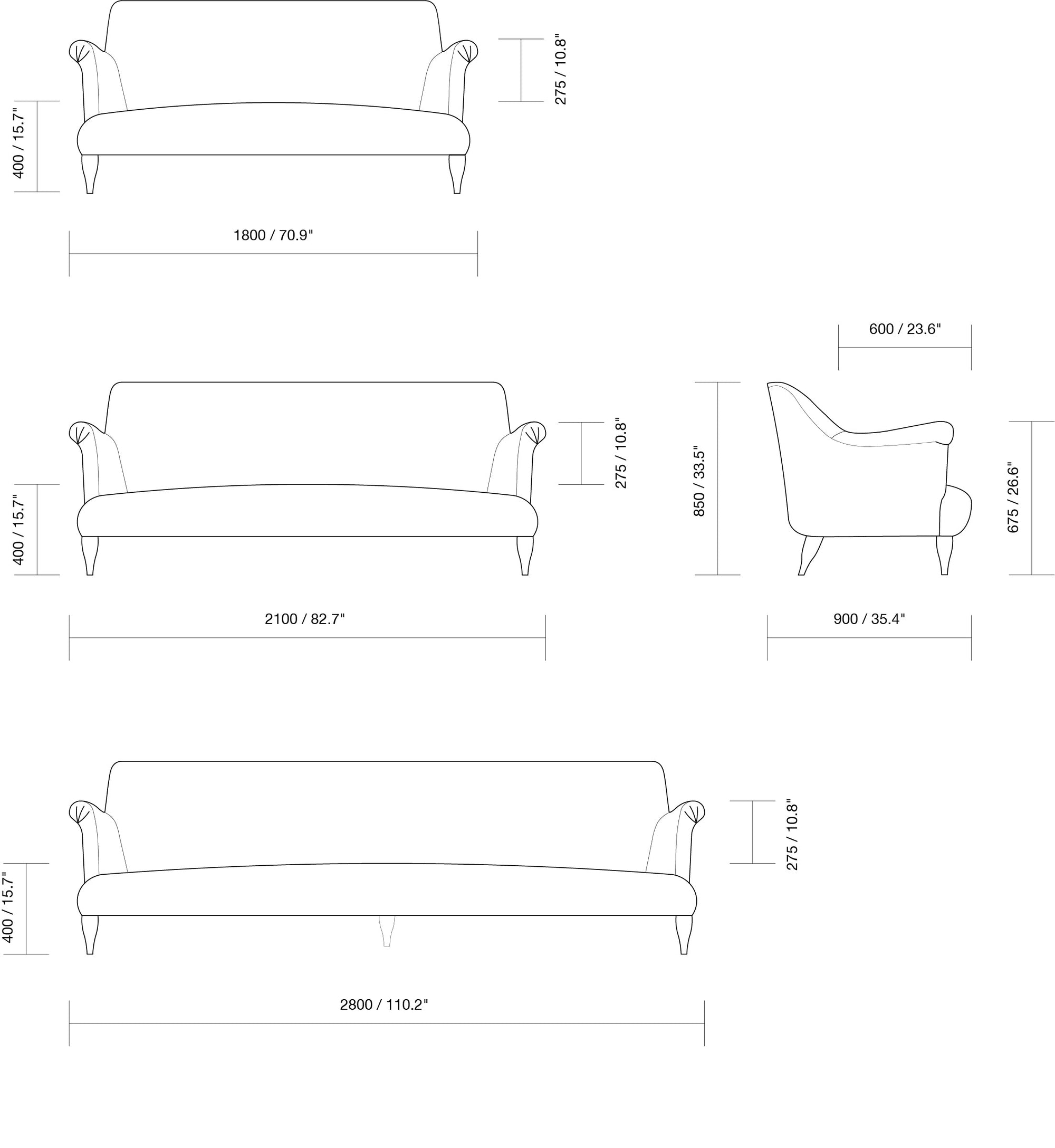Millimetres: 2100w × 900d × 850h (sh 400) Inches: 82.68w × 35.43d × 33.46h (sh 15.75)