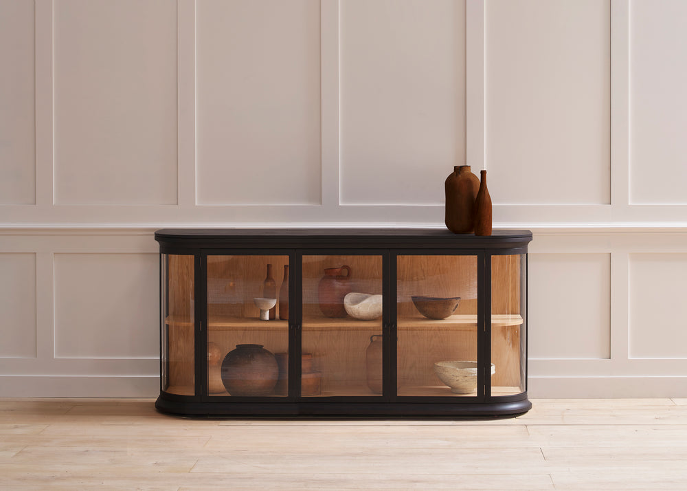 Designed for those who collect and exhibit, the Mercier sideboard glass boasts a curved solid oak frame, wrapped with radiused double mouldings at its top and centre. Its full glass exterior arcs at each corner, fronted with doors that open via dark bronze studio-designed handles to reveal a timber-lined interior. The sideboard houses two solid oak shelves, illuminated from the underside with discreet, warm LED lighting.